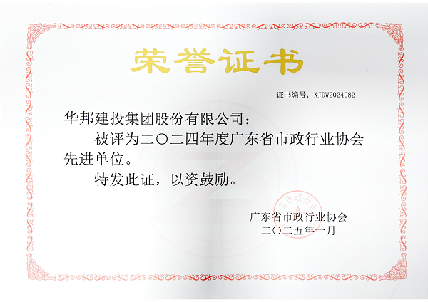 近日,经广东省市政行业协会评审,华邦建投集团荣获2024年度“广东省市政行业协会先进单位”荣誉。本次获评是对华邦建投集团建设能力、诚实经营、规范管理等综合实力的肯定。