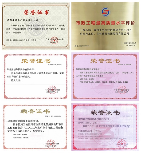 作为广东市场代表项目,华邦建投集团雷州市生活垃圾焚烧发电厂项目(以下简称:雷州电厂)始终坚持以高标准、严要求进行施工,努力做到项目管理专业化、工程施工标准化、日常管理精细化、管理手段信息化、发展理念人本化,不断推动工程质量管理水平的提升。因质量上乘,雷州电厂项目荣获2024年第十六届广东钢结构金奖“粤钢奖”、2024年度市政工程最高质量水平评价、2023年度广东市政金奖、2023年度“广东省市政优良样板工程”称号、2022年度“广东省市政工程安全文明施工示范工地”称号、广东省市政工程建设优秀QC小组活动成果三等奖等荣誉。