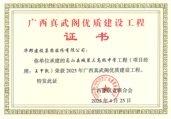 近日,由华邦建投集团承建的广西马山县城第三高级中学项目(以下简称:马山中学项目)荣获广西建设工程最高质量奖——2025年“广西真武阁优质建设工程”。此次获奖,既是对马山中学项目工程质量的充分肯定,也展现了华邦建投集团“干一个项目,树一座丰碑”的企业品牌实力与社会形象。