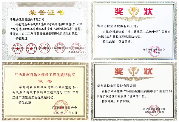 在项目建设过程中,华邦建投集团始终坚持“安全第一、质量为本”的理念,大力推行安全文明施工和精细化管理,积极应用新技术、新工艺、新设备,全面提升工程质量和安全水平。马山中学项目还荣获“2022年度甘肃省质量管理小组活动三等奖”“2022年第二批广西建设工程优质结构奖”“南宁市2022年建设工程优质结构奖”“2024年南宁市建设工程质量‘邕城杯'奖”等多项荣誉。