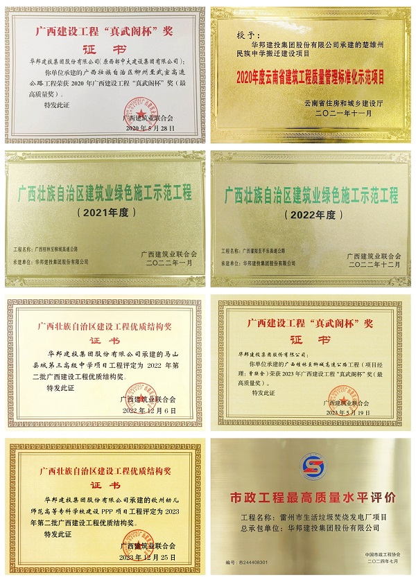 一直以来,华邦建投集团以“施工精细、技术精妙、管理精心、工艺精湛、精益求精”为目标,致力于创建品质工程。多个项目获省市级表彰,其中,广西柳州至武宣高速公路、桂林至柳城高速公路均获广西建设工程“真武阁杯”奖(广西工程质量最高奖)、广西桂林至柳城高速公路及广西灌阳至平乐高速公路获广西建筑业绿色施工示范工程、广西马山县城第三高级中学项目、钦州幼专学校项目获广西建设工程优质结构奖、甘肃榆中教育园区和榆中医院项目获“甘肃省建设工程文明工地”称号、云南楚雄民族中学搬迁建设项目获云南省建筑工程质量管理标准化示范项目、广东雷州电厂项目通过“2024年度市政工程最高质量水平评价”……