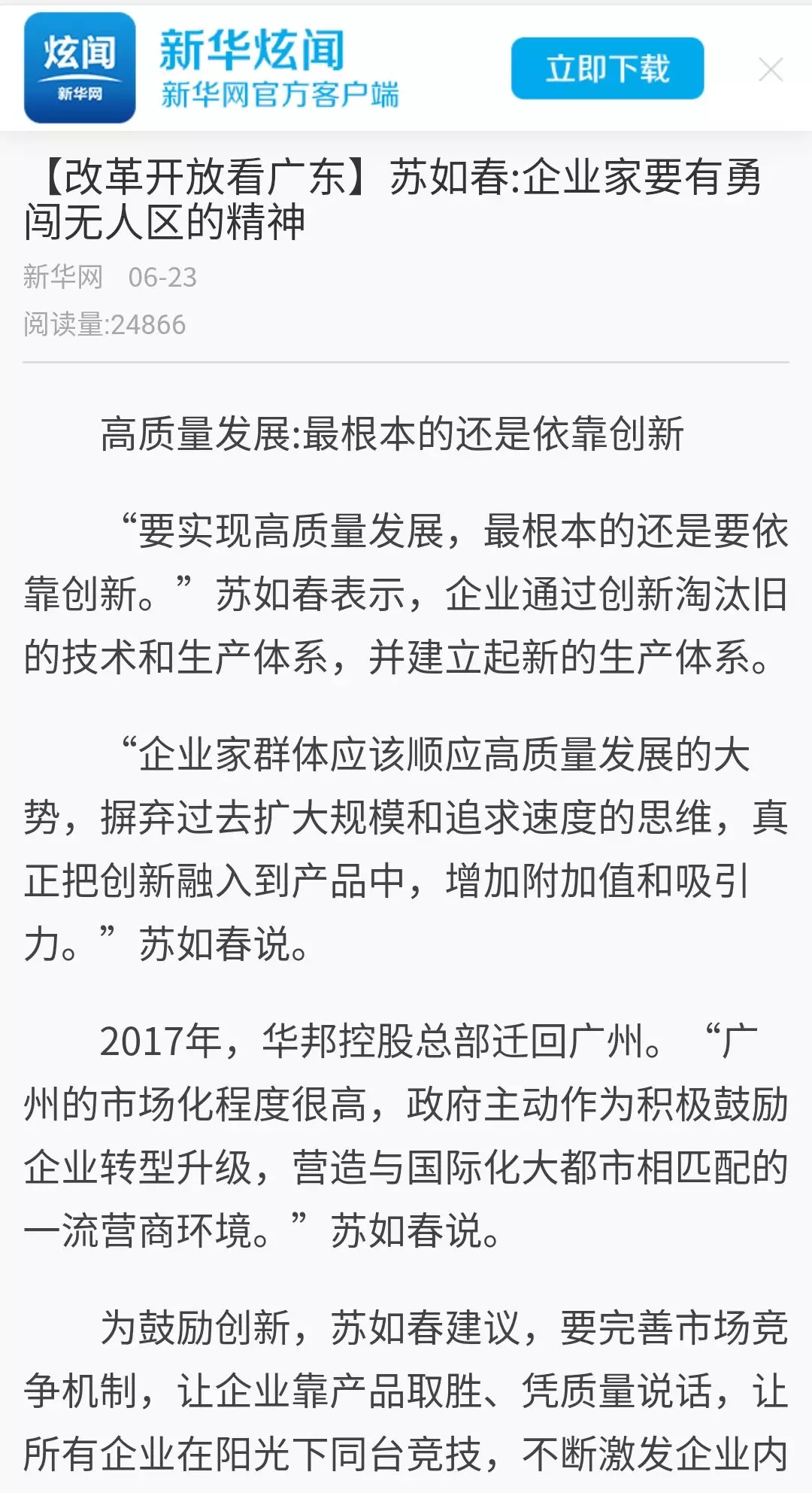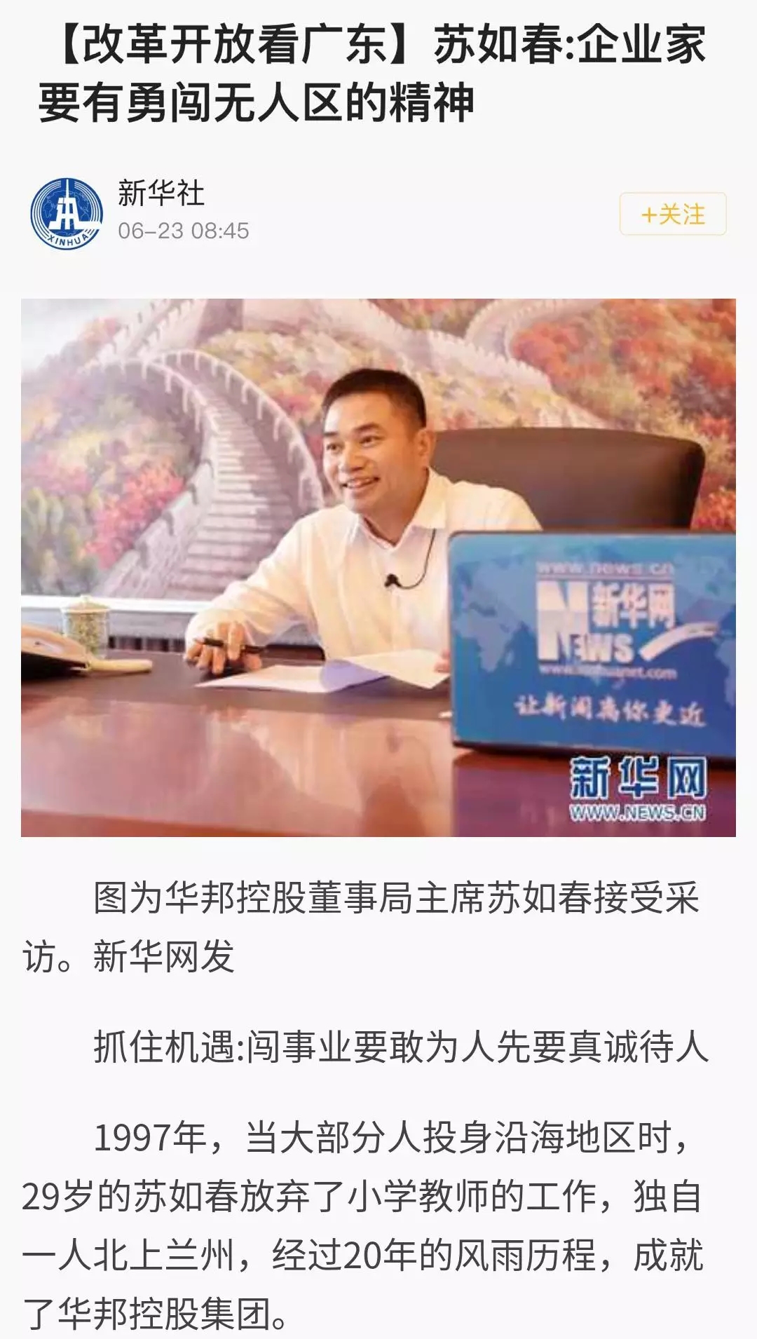 编者按: 40年前,中国改革开放在广东拉开帷幕,如今,粤港澳大湾区再次成为改革开放的前沿阵地,走进新时代的广东正努力推动形成全面开放新格局。为在这一重大历史节点总结和展现改革开放40年的成就,彰显改革开放前沿阵地——广东的担当与使命,新华网推出《改革开放看广东》系列访谈。 改革成就时代,时代造就英雄,英雄践行中国梦。站在改革开放四十年的历史节点上向后回望,我们会发现成功的企业都有着独到的战略眼光和长远的转型布局。新时代下,企业应如何抓住时代发展机遇,迎接挑战、求变求新?艰苦创业的企业家精神,与新时代的企业家精神有哪些异同?.....带着这些话题,新华网“改革开放40年40人”、“改革开放看广东”大型融媒体报道走进华邦控股集团有限公司,就企业战略转型升级、企业家精神等话题专访董事局主席、西部中大建设集团股份有限公司董事长苏如春。以下是新华网报道原文: 苏如春:企业家要有勇闯无人区的精神 新华网广州6月22日电(王厚启李幸子 赵璧君)20年前,随着改革开放的大潮,当无数人南下“寻梦”时,苏如春怀揣着对建筑业的梦想,独自一人从沿海走进西北。 20年后,他带领企业立足基建创新转型,推动多元化发展。近日,苏如春表示,“企业家要有勇闯无人区的精神,踩准时代的鼓点。” 华邦控股董事局主席、西部中大建设集团董事长苏如春接受采访 抓住机遇:闯事业要敢为人先要真诚待人 1997年,当大部分人投身沿海地区时,29岁的苏如春放弃了小学教师的工作,独自一人北上兰州,经过20年的风雨历程,成就了华邦控股集团。 回顾创业历程,苏如春认为主要得益于具备大局视野。“随着西部大开发战略的实施,相比于人人向往的东南沿海,兰州其实有更广阔的天地。” 在气候干燥的兰州,适应着南北方饮食的差异,不断学习了解北方建筑特色,苏如春深耕基建领域,站稳脚跟后,他认为,企业要拓展业务,实现多元化发展,需要两个条件,一是踩准时代的鼓点,懂得顺应时代大势;二是增量业务与存量业务之间实现产业互补,降低管理成本、提高生产效率。 创新观念:“把父母送到养老院也是一种孝顺” 目前,华邦控股已成为涵盖基础设施投资与建设、养老养生、保险金融、生态健康人居等领域的多元化企业。 模式转变后的华邦控股旗下美好家园养老集团提出构建居家为基础、社区为依托、机构为补充、医养相结合的养老服务体系。 “一体四翼”的养老服务模式分为:机构养老、社区养老、居家养老和旅居养老,其中机构养老、社区养老和居家养老可以满足大多数人基本养老服务,旅居养老则是满足更高层次的养老诉求。 苏如春认为,一定要用康养产业带动养老院发展,根据不同小镇因地制宜,形成特色。 “除了基本的养老服务,还要做到医养结合,通过养老辐射到地产、医疗、教育、陪护等领域,形成产业集群,带动就业。”苏如春说。 高质量发展:最根本的还是依靠创新 “要实现高质量发展,最根本的还是要依靠创新。”苏如春表示,企业通过创新淘汰旧的技术和生产体系,并建立起新的生产体系。 “企业家群体应该顺应高质量发展的大势,摒弃过去扩大规模和追求速度的思维,真正把创新融入到产品中,增加附加值和吸引力。”苏如春说。 2017年,华邦控股总部迁回广州。“广州的市场化程度很高,政府主动作为积极鼓励企业转型升级,营造与国际化大都市相匹配的一流营商环境。”苏如春说。 为鼓励创新,苏如春建议,要完善市场竞争机制,让企业靠产品取胜、凭质量说话,让所有企业在阳光下同台竞技,不断激发企业内在创新力;建立风险共担机制,把风险降到最低,激励更多人敢于试错、大胆创新;确立监督管理机制,优化市场监管机制流程,政府简政放权,将创新活力转化为发展效益。 同步报道 新华网官方客户端报道 新华网手机版报道 新华社搜狐号报道