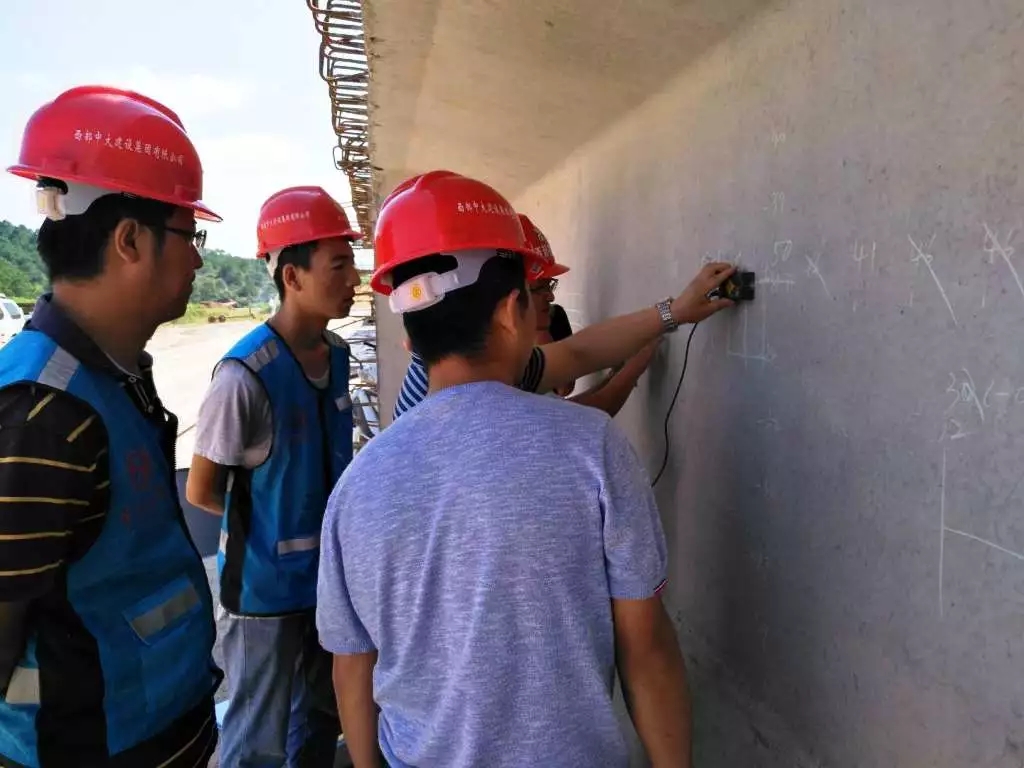在广西梧州环城项目施工现场,甘肃信尔达工程试验检测有限公司员工精心检测预制梁,确保工程质量