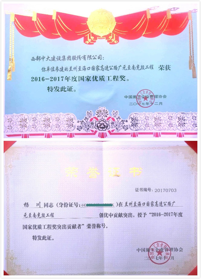 近日,国家优质工程奖总结表彰大会在北京人民大会堂召开。会议表彰了2016至2017年度国家优质工程奖,由西部中大建设集团股份有限公司承建GN12合同段的兰州至海口国家高速公路广元至南充段工程榜上有名。这是继荣获四川省建设工程“天府杯金奖”(省优质工程金奖)后,该项目再次获得的国家级大奖。同时,集团公司董事、时任项目经理杨川获得“国家优质工程奖突出贡献者”荣誉称号。