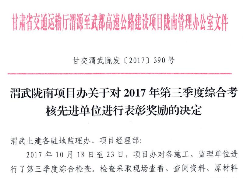 近日,渭源至武都高速公路陇南段项目办组织开展了2017年第三季度综合考核评比活动,采用现场查看、查阅资料、原材料检测和实体工程检验等方式对渭武路陇南段各项目部进行了综合评比,由集团公司承建的渭武高速公路第十二合同段在本次综合评比中获得第一名的好成绩,并全线通报表扬,获得50万元奖励。