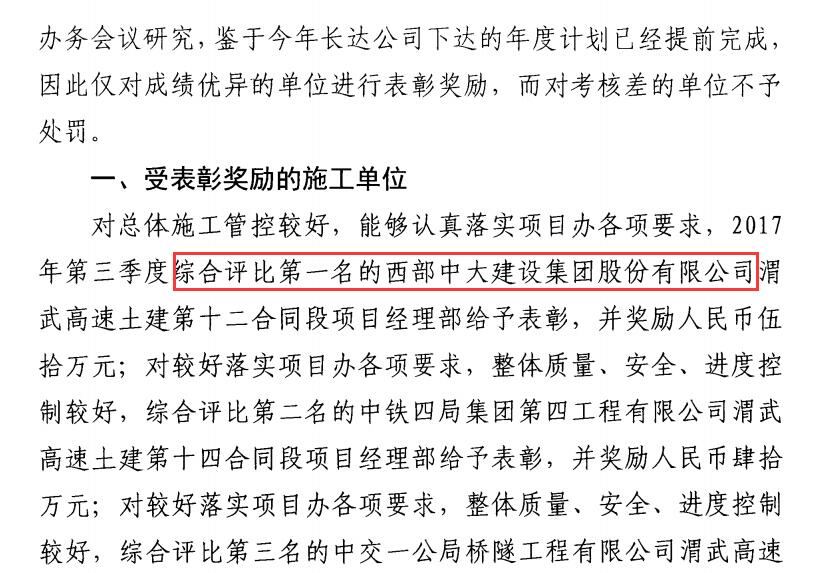 第三季度受到业主部门的表彰和奖励既是对集团公司在渭武高速公路施工管理过程中的肯定,也是对下阶段施工任务目标的指引,集团公司和项目部将以本次考核评比活动为契机,在“五化建设”管理方针的指导下,进一步精益求精,统筹规划,合理安排工期,保质保量完成渭武高速公路工程年度施工任务目标。