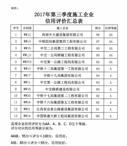 同时,渭武高速公路陇南段项目办结合项目管理有关制度和办法,开展了参建单位第三季度信用评价考核评比,集团公司在此次评比中从参加考核、评比的十三个施工、监理单位中脱颖而出,综合得分位列首位,信用等级被评为“AA”级。