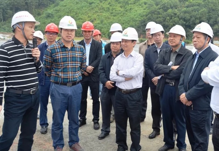 广西自治区交通运输厅总工程师王劼耘(前排右三)现场听取项目建设汇报