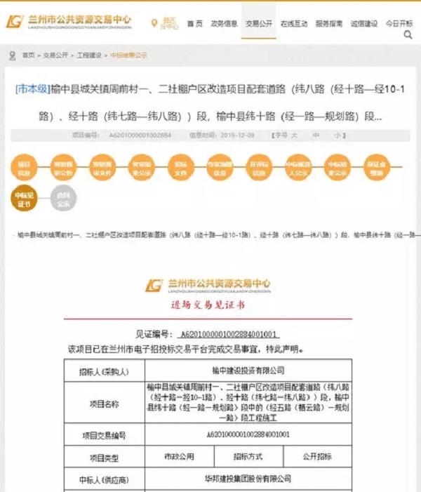 甘肃省兰州市榆中县城关镇周前村一、二社棚户区改造项目配套道路(纬八路(经十路—经10-1路)、经十路(纬七路—纬八路))段,榆中县纬十路(经一路—规划路)段中的(经五路(栖云路)—规划一路)段工程施工项目。工程内容包括道路、涵洞、给水、雨水、污水、照明、交通设施及绿化工程,道路路面为沥青混凝土路面。该项目为华邦建投集团在榆中县的首个中标项目,为集团公司未来在榆中地区的市场开发奠定了坚实基础。