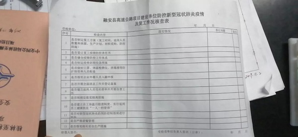 当天下午,检查组一行来到桂柳五标项目部,详细了解项目部生产生活保障及疫情防控工作开展情况,听取复工复产准备情况及存在的问题和困难,并详细对照《融安县高速公路项目建设单位防控新冠状肺炎疫情及复工情况核查表》的13项内容进行逐项排查。
