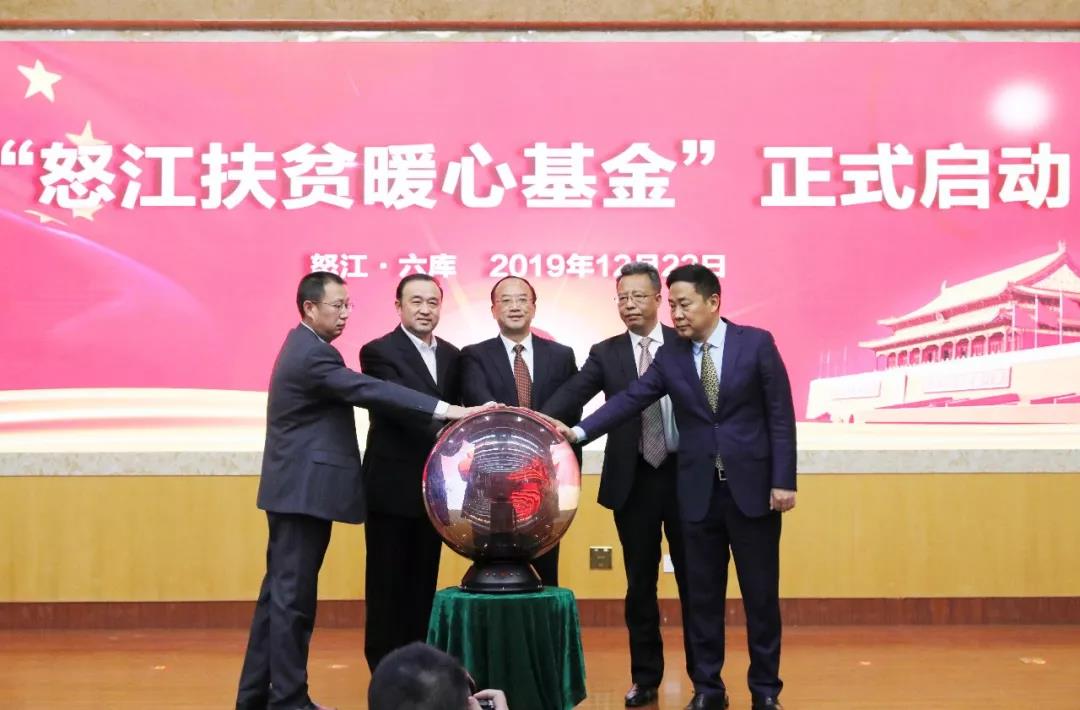 ▲怒江州委书记纳云德(中),州长李文辉(右二),华邦控股集团党委书记万章热(左二)等领导共同启动“怒江扶贫暖心基金”