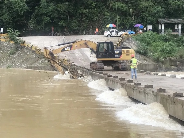 暴雨倾泻,河水陡涨,便道滑塌,便桥淹没。受连日强降雨影响,桂柳三标1、2号便桥被洪水淹没,为保证周边居民以及行人、行车安全,项目领导积极组织人员对1、2号便桥水势24小时实行动态监视,桥头加设禁止行人通行防护栏。