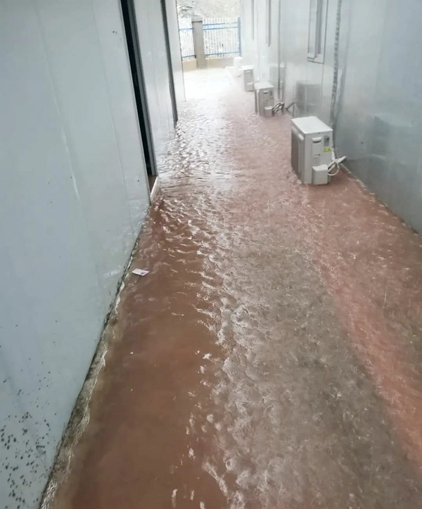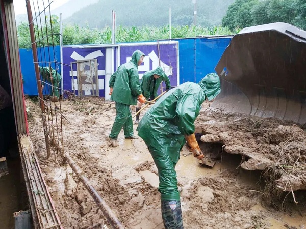 6月5日凌晨,桂柳五标三睦隧道场站遭受暴雨山洪袭击,场站生活区活动板房、钢筋加工场、料仓遭严重损坏,物资、机械、设备损失严重,洪水最深超过1.5米。面对突如其来的灾难,项目部领导班子赶赴一线指挥抗洪救灾救援工作,迅速组织开展灾后自救工作,在周边设置警示带,将高压电源切断,组织场站人员紧急撤离至安全地带,妥善安排住宿问题,并及时组织挖机、装载机将路面及河道的垃圾进行清除,确保水流畅通。