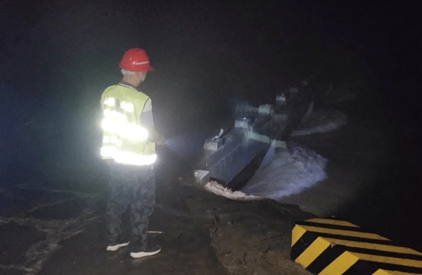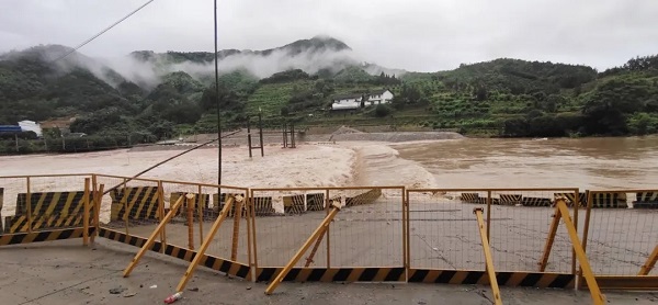▲ 被洪水淹没的便桥以及桥头的防护措施