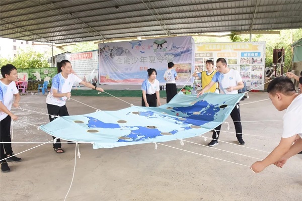 团建高潮是“环游世界球”项目,它要求全队配合协作使世界球按照一定的规则路线,从起点到终点,要求世界球在运行过程中不能掉落。就像华邦交投身为华邦建投一体两翼中的投资翼,不仅需要犀利的投资眼光,还需要做好风险评估、保持高度的危机感。一声哨响,所有队员在队长的带领下,拉起世界球地图的边缘,慢慢的让世界球在地图内滚动。有时用力过猛导致球体落地,队员也毫不泄气,短暂的总结分析后又重新开始。炎热的天气让所有队员们都汗流夹背,但他们顾不上擦拭,精神高度集中,双手紧握控制绳,双眼紧紧盯着滚动的世界球,慢慢地、慢慢地,世界球从起点一点点的滚向了终点。