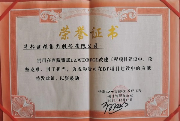 近日,华邦建投集团再次受到业主表彰,赞扬华邦建投在西藏错那项目建设中“攻坚克难、勇于担当”的精神;同时,项目负责人程国利也喜获“先进个人”的光荣称号。此次表彰是西藏自治区交通行政主管部门对华邦建投履约能力的高度赞扬,不仅为华邦建投的品牌形象增光添彩,也为后续在西藏自治区的良好发展奠定了坚实的基础。