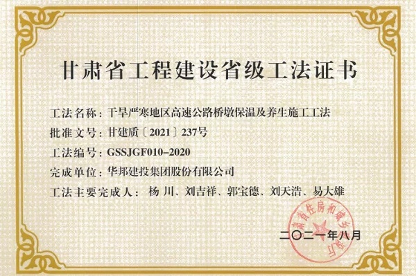 8月,荣获省级工法《干旱严寒地区高速公路桥墩保温及养生施工工法》