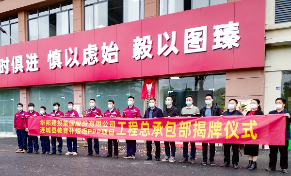 3月26日,华邦建投集团连城县教育补短板PPP项目总承包部(以下简称:连城教育项目部)揭牌,标志着项目前期筹备工作取得阶段性成果。福建省龙岩市连城县政协提案委员会主任罗大钧,教育卫生体育委员会主任李元海;福建连城国有投资集团有限公司副总经理曹晖;龙岩博华育才投资有限公司项目负责人凡爱平;连城教育项目部负责人李浩等参加仪式。