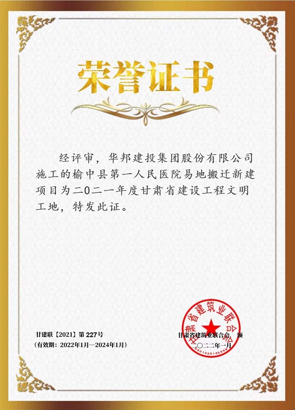 2022年1月,从甘肃省建筑业联合会传来喜讯,经相关专家组评审,榆中医院项目荣获2021年度“甘肃省建设工程文明工地”称号,这是对榆中医院项目安全管理、文明施工的肯定,也是对华邦建投建设能力的高度认可。