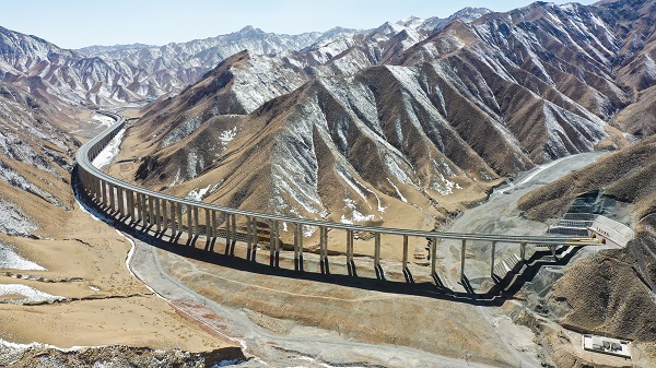 一桥连两山,一隧变通途。由华邦建投承建的敦当高速项目试验Ⅰ标包含全线控制性工程“大巴特沟特大桥”“当金山特长隧道”。其中,大巴特沟特大桥是柳园至格尔木国家高速公路(G3011)建设项目全线最长的一座特大桥,其位于阿克塞县城海拔3400米的当金山无人区,全长2600米,最大桥高63.5米,因其独特的高原气候条件,被誉为“陇上高原第一桥”;当金山隧道右线长4424米、左线长4441米,属高寒干旱地区双洞石质特长隧道。