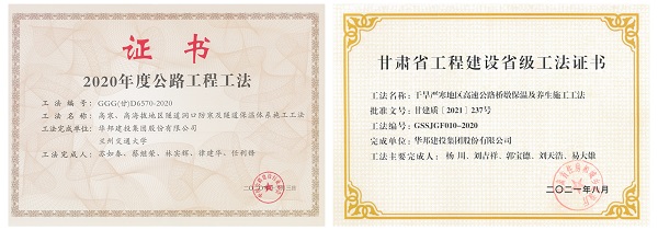 至诚至精,天道酬勤。华邦建投敦当项目捷报频传,2019年10月23日,大巴特沟特大桥实现双向贯通;2020年8月11日,当金山特长隧道实现双线贯通;2020年8月23日,华邦控股集团董事局主席、华邦建投集团董事长苏如春与现场的建设者们一起,完成最后一联桥面铺装浇筑,标志着敦当项目控制性工程全部完成。 一个个重大节点背后,作为参建企业,华邦建投以“能吃苦、能吃亏、讲诚信、相互成就”的企业品格在敦当项目建设过程中不断获得殊荣。由华邦建投申报的《高寒、高海拔地区隧道洞口防寒及隧道保温体系施工工法》荣获2020年度全国公路工程工法;《干旱严寒地区高速公路桥墩保温及养生施工工法》荣获甘肃2020年度甘肃省工程建设省级工法;敦当项目连续两年获评AA信誉评价。除此之外,敦当项目部还多次受到业主嘉奖。
