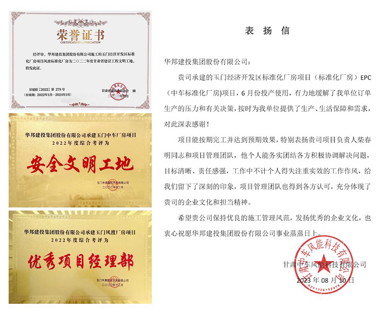 “干一个项目,树一座丰碑。”该项目的工程品质能力得到了各级单位及业主的认可,荣获2022年度“甘肃省建设工程文明工地”称号;被业主单位评选为2022年度“安全文明工地”和“优秀项目经理部”;今年8月,项目使用单位送来表扬信,表达对华邦建投集团工程建设能力的肯定。