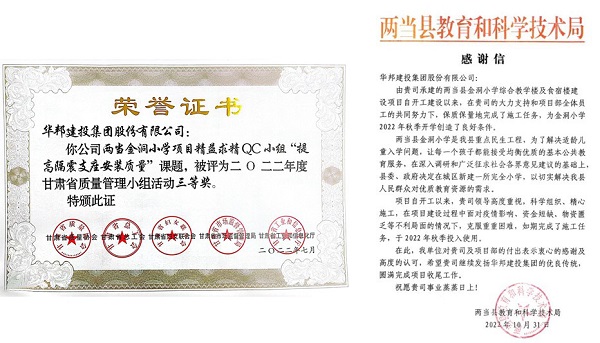 “干一个项目,树一座丰碑。”该项目的工程品质能力得到了各级单位及业主的认可,荣获甘肃省质量管理QC成果三等奖,同时项目使用单位也送来表扬信,表达对华邦建投集团工程建设能力的肯定。