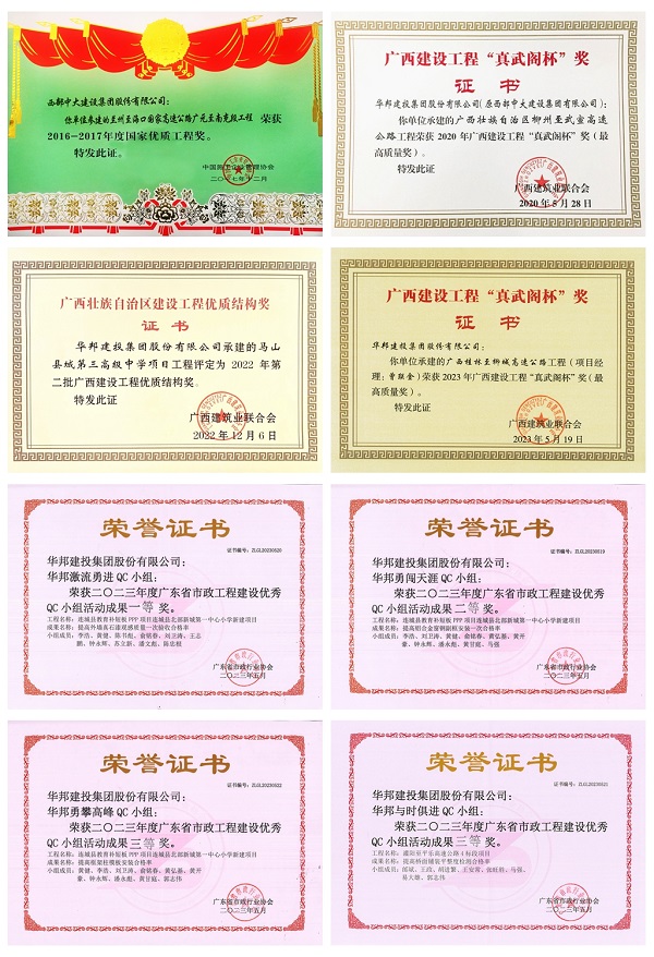 一直以来,华邦建投集团高度重视质量管理工作,注重工程施工过程中的节能降耗与生态环保要求相结合,积极推进先进的质量管理工具和方法在活动中的应用,助力品质工程创建和企业高质量发展。多个项目获得多项荣誉,其中,兰州至海口国家国家高速公路广元至南充段工程荣获2016-2017年国家优质工程奖;广西柳州至武宣高速公路、