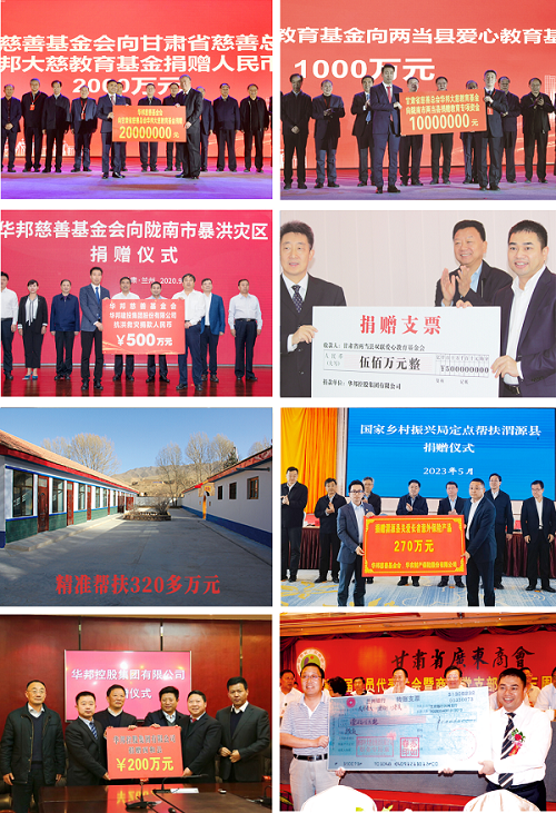 义利合一,回报社会。自成立以来,华邦将社会责任提高到自身发展的战略高度,以产业致力民生,最大程度与社会共享发展成果,累计捐款捐物数亿元。在“家乡”甘肃,华邦更是不遗余力履行担当,通过教育助学、援助赈灾、光彩事业等多方式支持甘肃公益慈善事业的发展:与甘肃省慈善总会共同发起成立华邦大慈教育基金,华邦慈善基金会向华邦大慈教育基金捐赠2000万元,华邦大慈教育基金向陇南市两当县“爱心教育基金”捐赠1000万元;向陇南市暴洪灾区捐赠500万元,支持抗洪救灾和灾后重建;向陇南市两当县“爱心教育基金”捐赠500万元,助力当地教育事业发展;向金昌市永昌县马营沟村投入320余万元,助力该村精准脱贫;向定西市渭源县捐赠价值270万元的保险保障,助力乡村振兴;向陇南市西和县捐赠200万元援建帮扶车间,进行产业帮扶;向“光彩陇原行暨智慧陇原行”活动捐赠150万元;向甘肃光彩事业促进会捐赠100万元;向定西市岷县冰雹洪涝灾区捐赠100万元……在陇原大地,华邦以实际行动为建设幸福新甘肃汇聚大爱暖流。