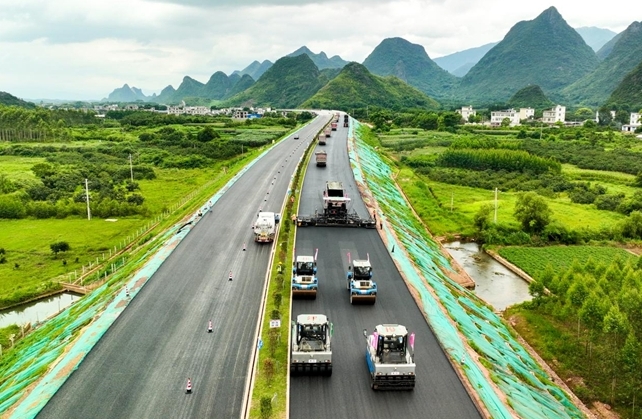 广西灌阳至平乐高速公路项目无人摊压机群施工现场