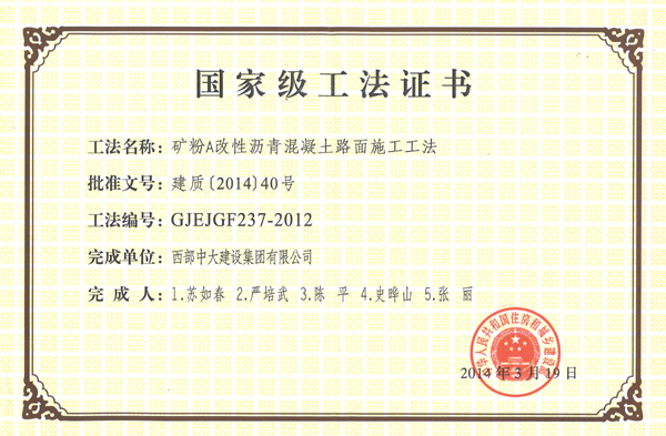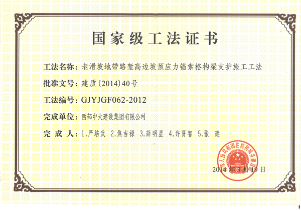 在2014年3月19日公布的2011-2012年国家级工法名单中,西部中大建设集团有限公司完成的《老滑坡地带路堑高边坡预应力锚索格构梁支护施工工法》被评定为国家级一级工法、《矿粉A改性沥青混凝土路面施工工法》、《软弱破碎围岩隧道钢拱架锁定施工工法》被评定为国家级二级工法。这是集团公司科技开发工作取得的新成果,也是集团成立以来首次荣获最高级别的工法。