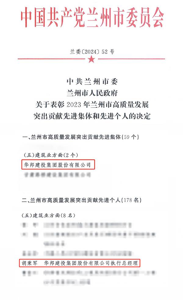 近日,中共兰州市委办公室、兰州市人民政府办公室印发《关于表彰2023年兰州市高质量发展突出贡献先进集体和先进个人的决定》,华邦建投集团荣获“2023年度兰州市高质量发展突出贡献先进集体”称号;华邦建投集团执行总经理胡秉军荣获“2023年度兰州市高质量发展突出贡献先进个人”称号。两项荣誉称号的获得,是对华邦建投集团助力兰州市高质量发展取得成效的认可,也是对企业以实干树形象、以实绩促发展的肯定。