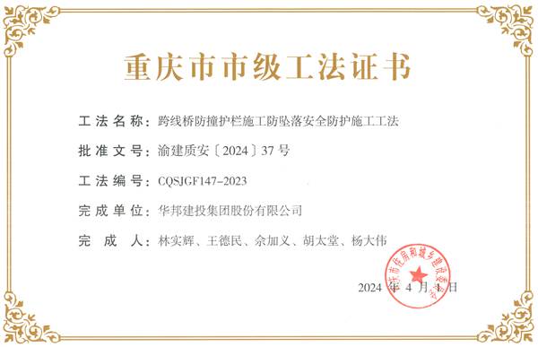 无独有偶,由华邦建投集团依托重庆合川高速公路项目重点控制性工程涪江特大桥研发的《跨线桥防撞护栏施工防坠落安全防护施工工法》,荣获重庆市市级工法。