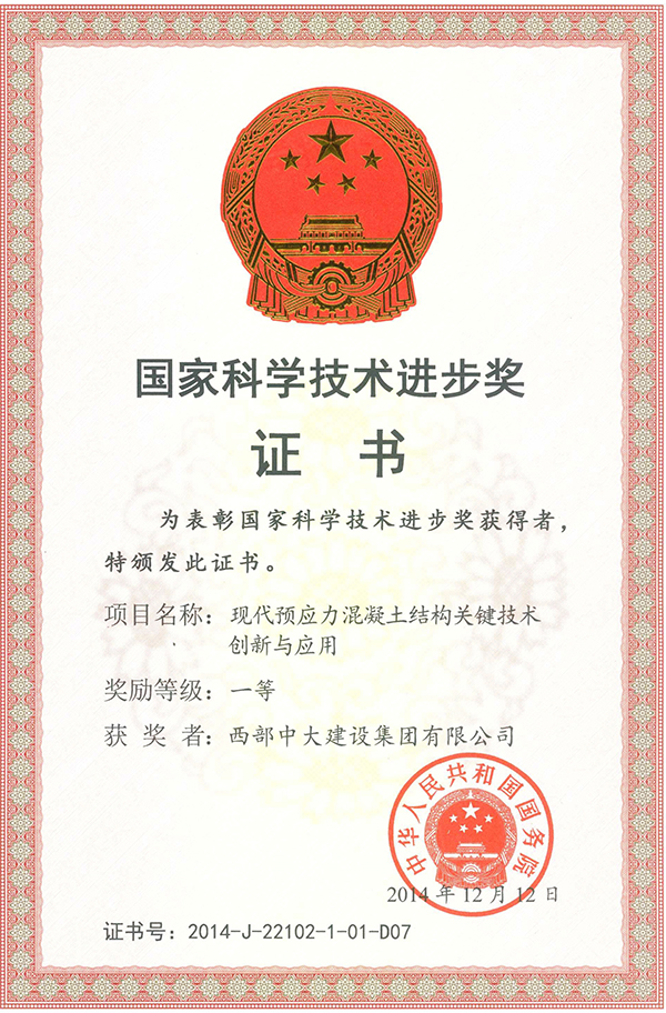 2015年1月9日, 2014年度国家科学技术奖励大会在北京举办,表彰2014年度为我国科技进步、经济社会发展作出突出贡献的科学技术人员和单位。华邦控股旗下西部中大建设集团和东南大学、吕志涛院士等共同研发的《现代预应力混凝土结构关键技术创新与应用》荣获国家科技进步一等奖。