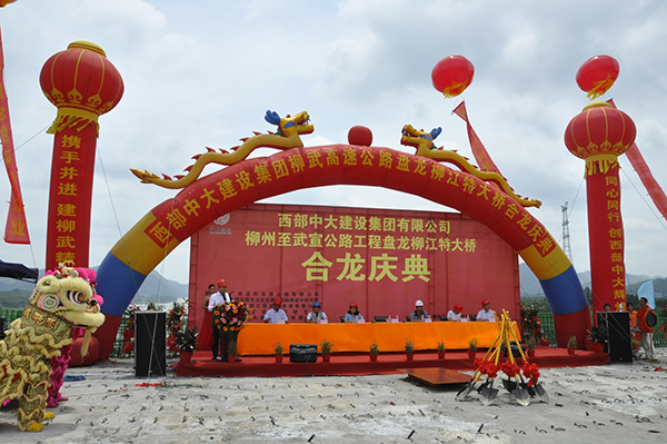 2015年7月3日,桂中盛夏,阳光灿烂,柳武三标,彩旗猎猎,特大桥上,喜气洋洋。西部中大建设集团有限公司承建的柳州至武宣高速公路盘龙柳江特大桥全桥胜利合龙。在当日举行的特大桥合龙庆典仪式上,华邦控股集团、西部中大建设集团有限公司、广西自治区交通规划勘察设计研究院、广西八桂工程监理咨询有限公司、广西交通科学研究院以及广西龙和高速公路有限公司等参建单位有关领导共同见证了这一激动人心的时刻。