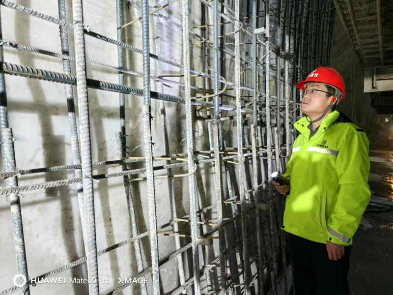 何鹏检查隧道二次衬砌钢筋施工质量。通讯员 高建峰 摄