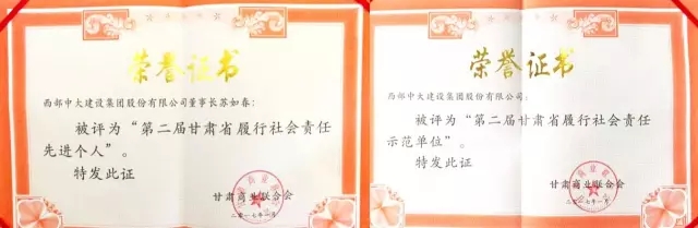 1月23日,由甘肃省商业联合会举办的第二届“甘肃省履行社会责任示范单位及先进个人”颁奖大会在兰州举行。西部中大建设集团股份有限公司荣获“甘肃省履行社会责任示范单位”称号。全国政协委员,甘肃省工商联副主席,华邦控股集团董事局主席苏如春荣膺“甘肃省履行社会责任先进个人”荣誉称号。