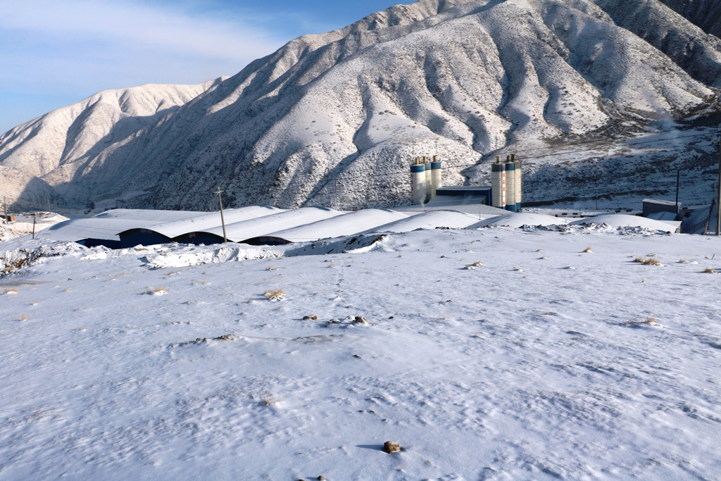 冰雪覆盖下的敦当高速公路项目拌合站场景