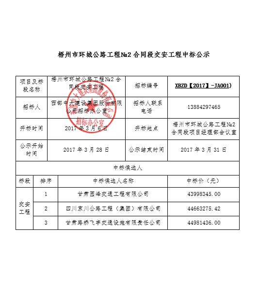 梧州市环城公路工程№2合同段交安工程中标公示