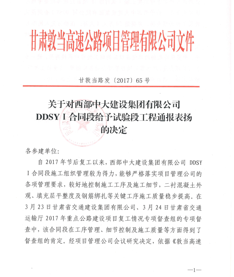 3月28日,敦当项目收到项目办下发的《关于对西部中大建设集团有限公司DDSYI合同段给予试验段工程通报表扬的决定》。“文件”对敦当高速公路建设项目取得的成绩进行了通报表扬,并奖励人民币50万元。